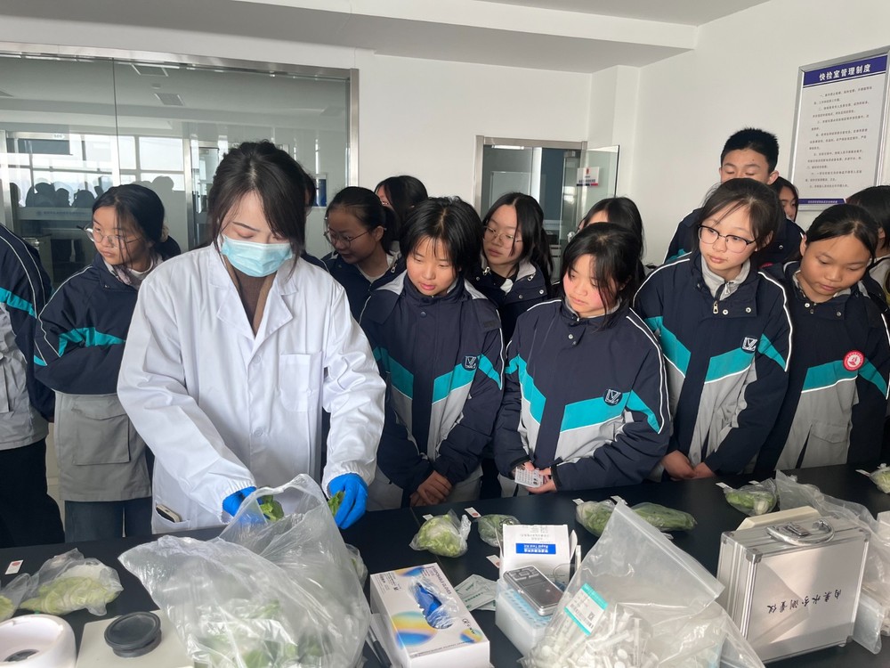 讲座结束后,同学们在中心人员带领下进入实验室。在食品检测室,学生们观摩了蔬菜样品农药残留的提取、净化和气相色谱仪测定农药残留的操作运行。在食品安全快检室,中心工作人员为学生们演示了蔬菜中农药残留快速测定,并让学生积极主动参与到实验中来,激发学生的求知欲望。